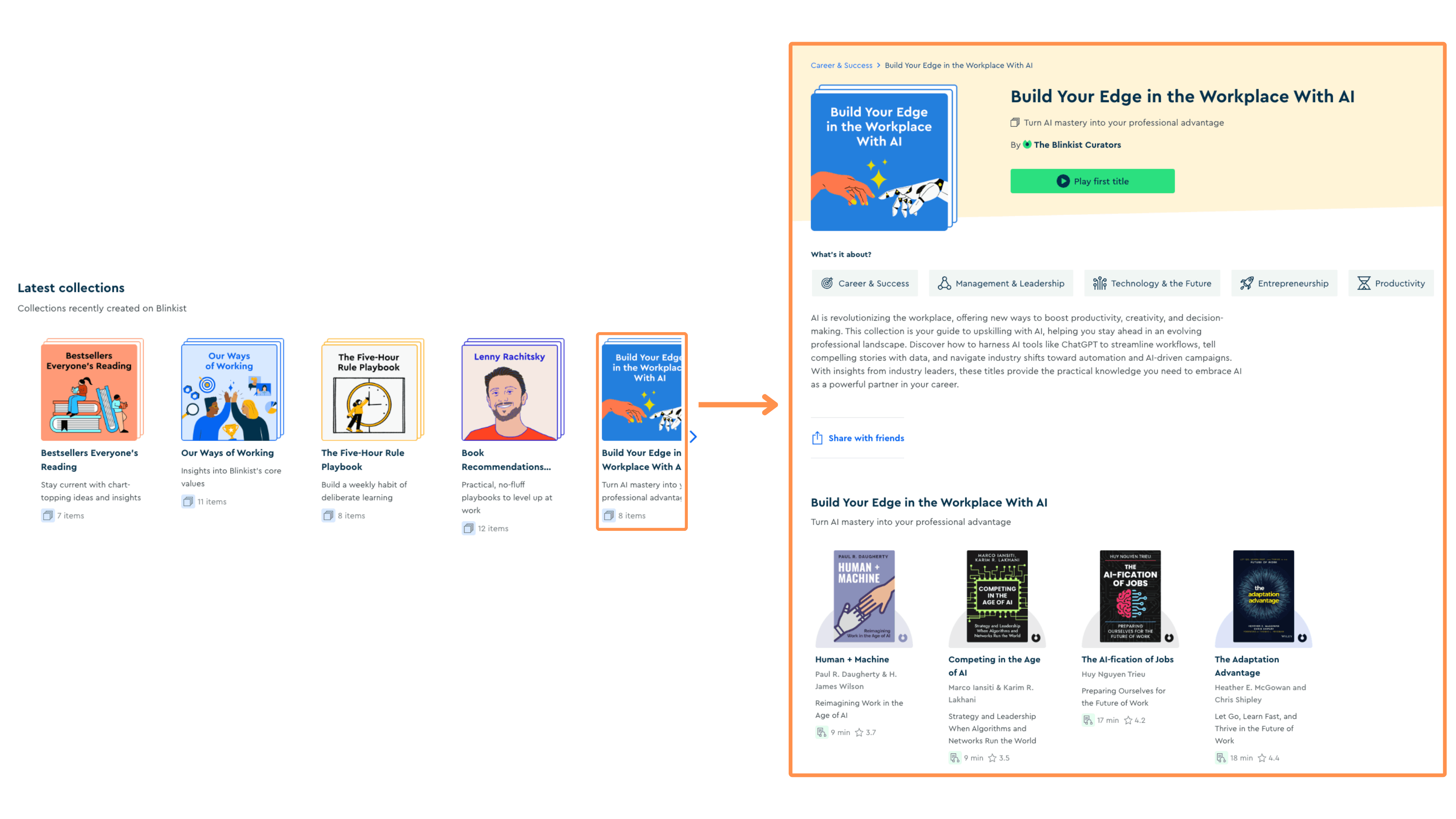 Collections → Similar to Blinkist and Headway, Shortform offers Collections — curated lists of book summaries to make you more knowledgeable on a specific topic.