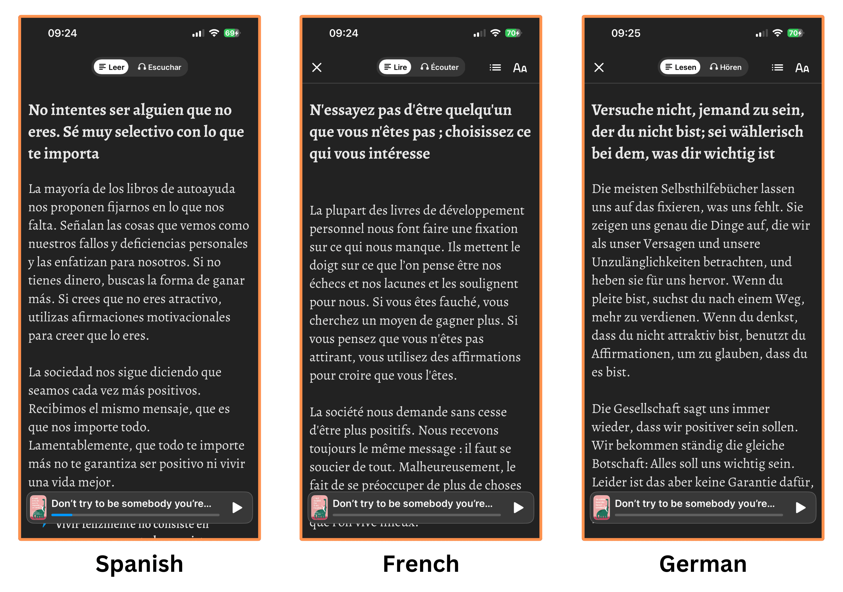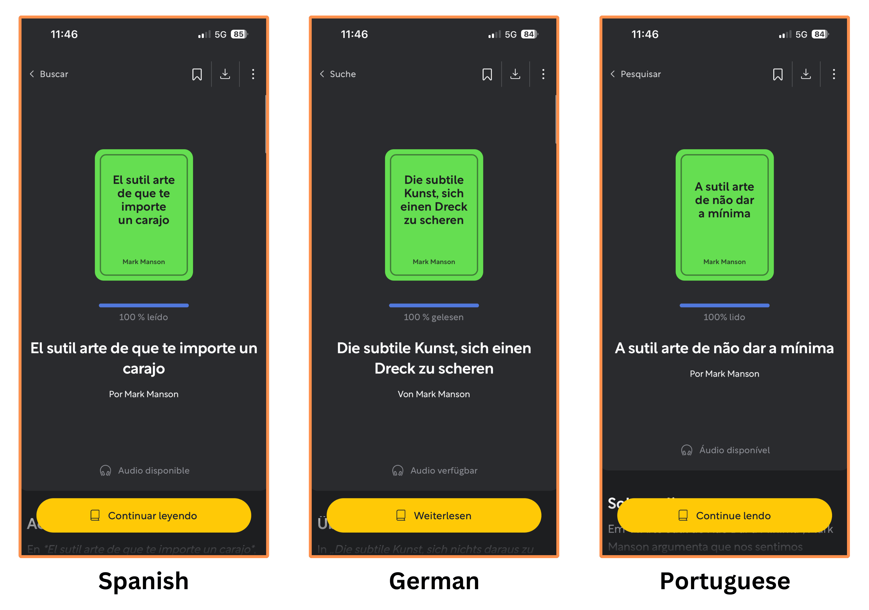 Blinkist’s summaries are also available in Spanish, German, and Portuguese. I think that’s very cool if you’re learning any of these languages, or (of course) if you’re a native in any of them. Although I couldn’t find their summary of The Subtle Art of Not Giving a F*ck in Portuguese.