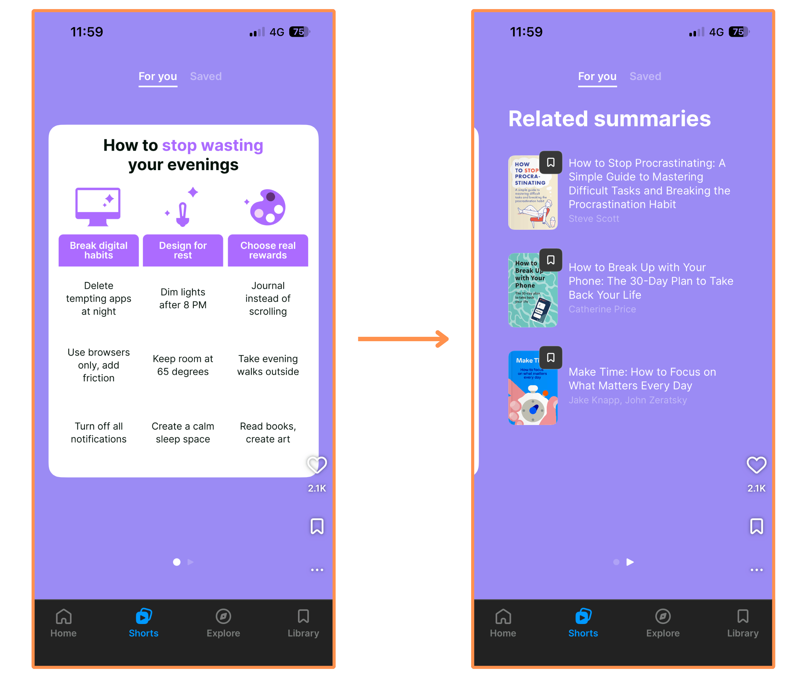 Text Shorts → These are displayed in a carousel-style format, and they link to a book summary at the end.