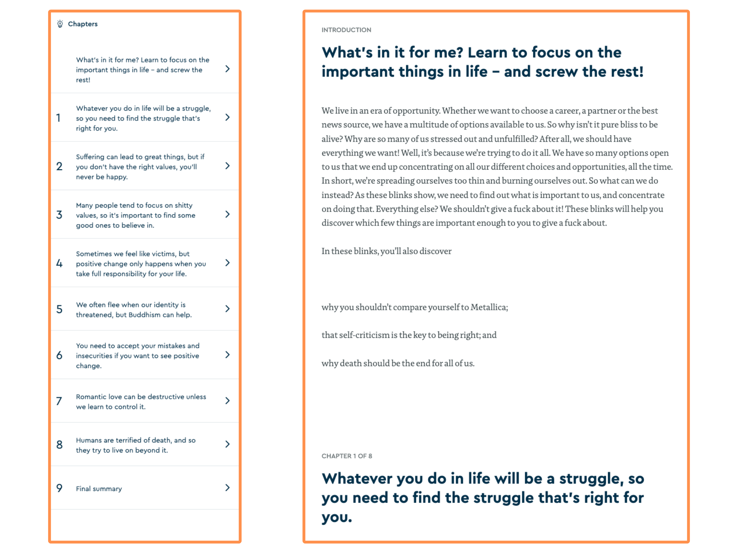 In their summary of the book The Subtle Art of Not Giving a F*ck, they have 10 chapters and 8 “key ideas.”