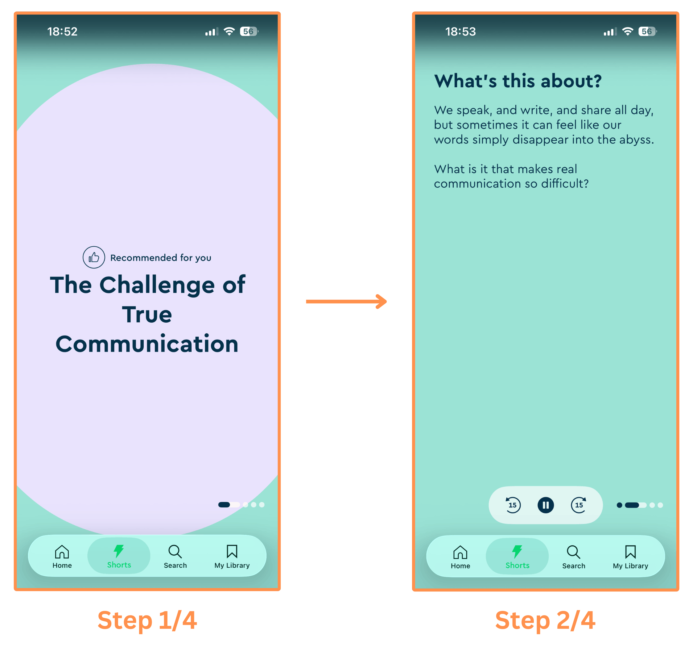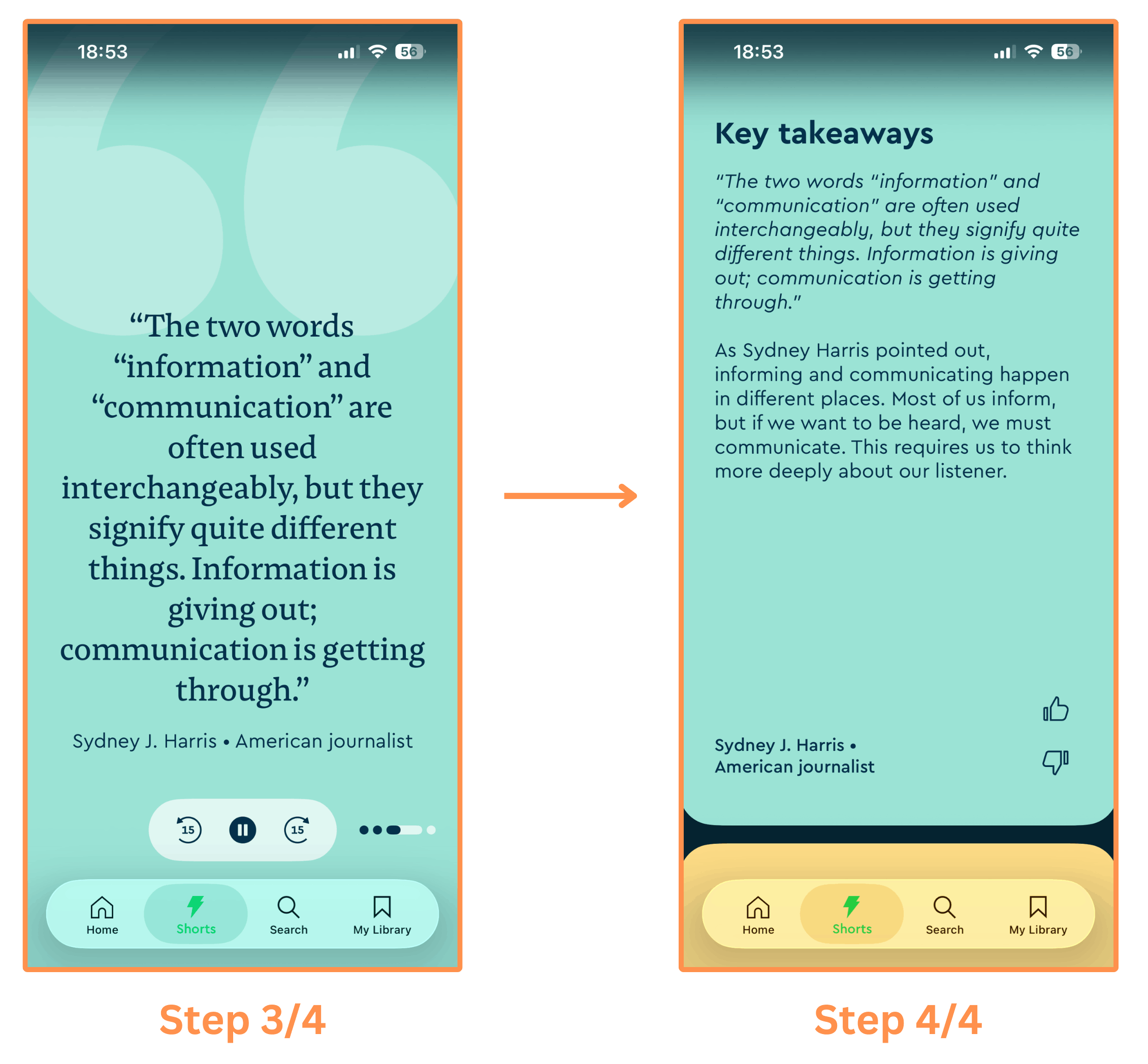 Shorts (mobile-only feature) → These are super fun introductions to the book summaries (featuring insights, interesting facts, and stories). They have text shorts and infographic shorts (similar to Instagram posts), and video shorts (similar to Instagram reels). And you swipe vertically to move through them.