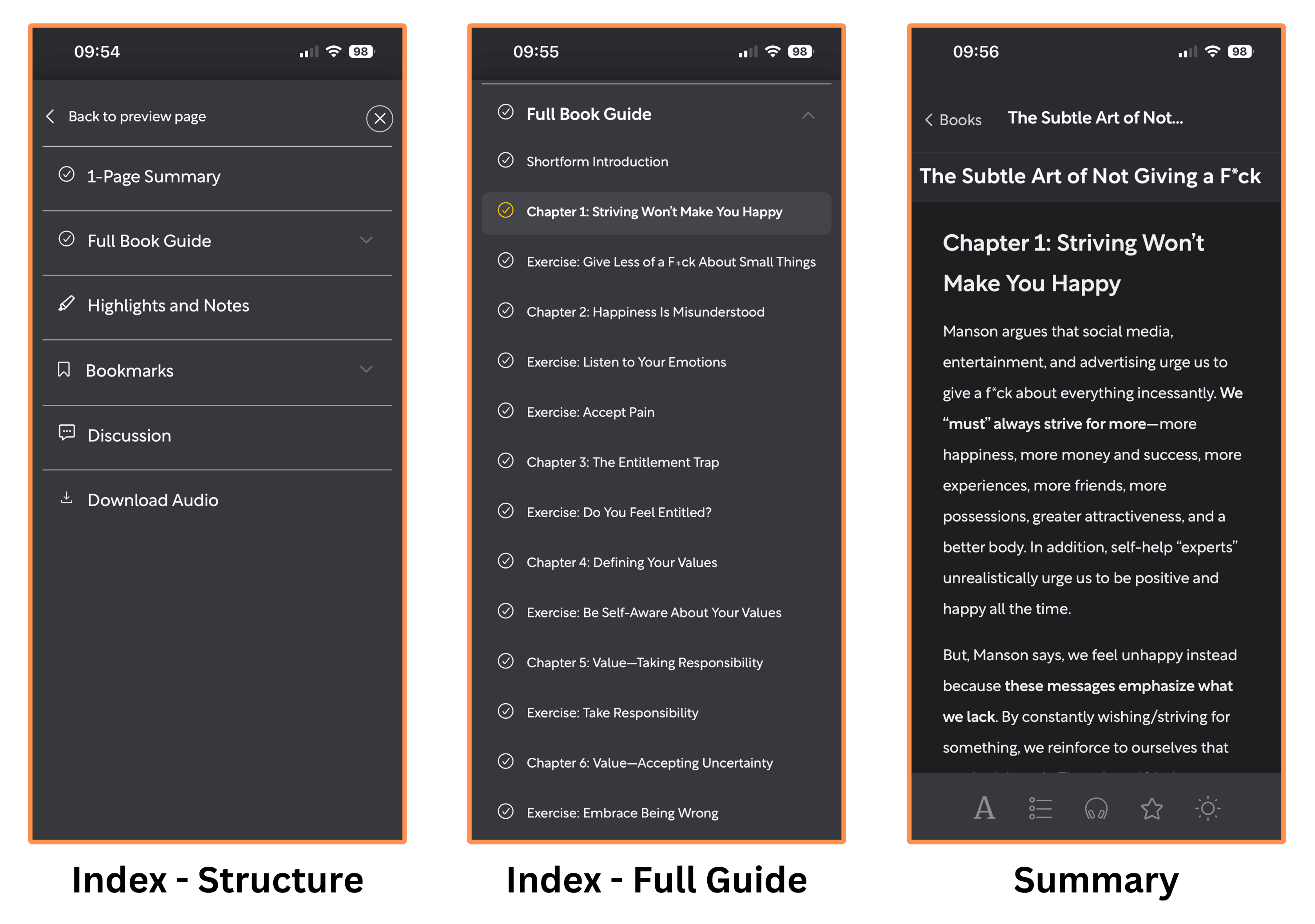 A summary is structured in chapters. The first chapter is always an introduction, the next chapters are the “Key Ideas”, and the last chapter is a “Final Summary” (sort of a short conclusion).