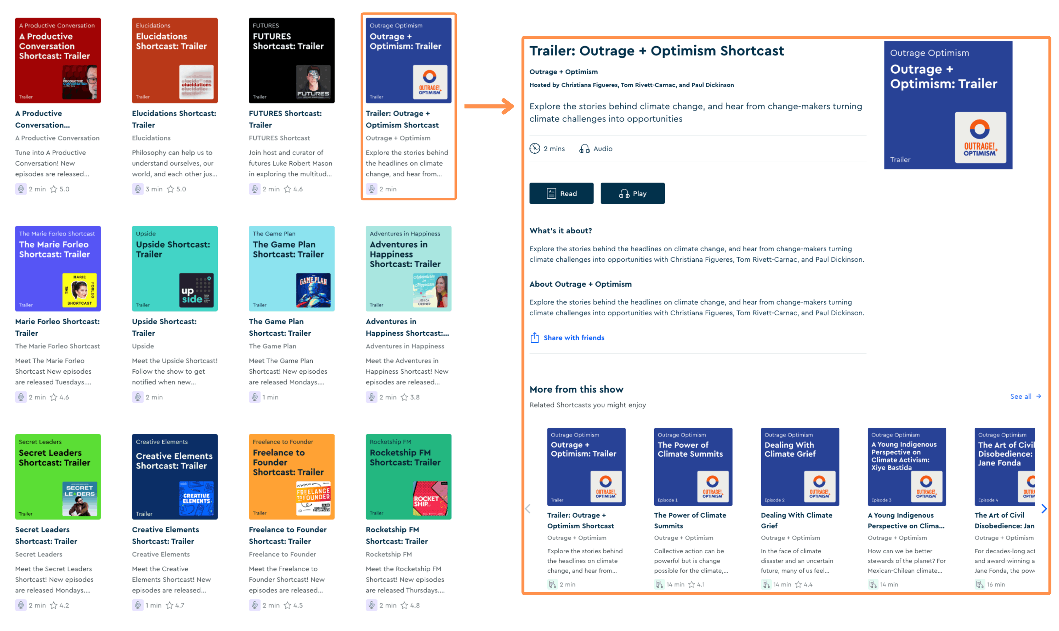 Playing with the word Podcasts, Blinkist created Shortcasts — podcast shows that you can only find on Blinkist. There are 16 different shortcasts, each focused on delivering key ideas within a specific area (which is also why episodes are super short — typically around 10–15 minutes).