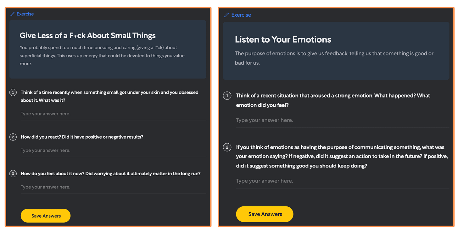 Personally, Shortform is still my favorite book summary app. Mainly because their summaries feel more like study guides: they are (by far) the most in-depth, they have chapter-by-chapter breakdowns, helpful notes, exercises, and it also comes with a note-taking feature (which is great for personal reflection). All of this is incredibly helpful for gaining a deeper understanding of the books’ ideas. Plus, authors like Mark Manson (The Subtle Art of Not Giving a F*ck), James Clear (Atomic Habits), and Sahil Bloom (The 5 Types of Wealth) have all recommended Shortform.
