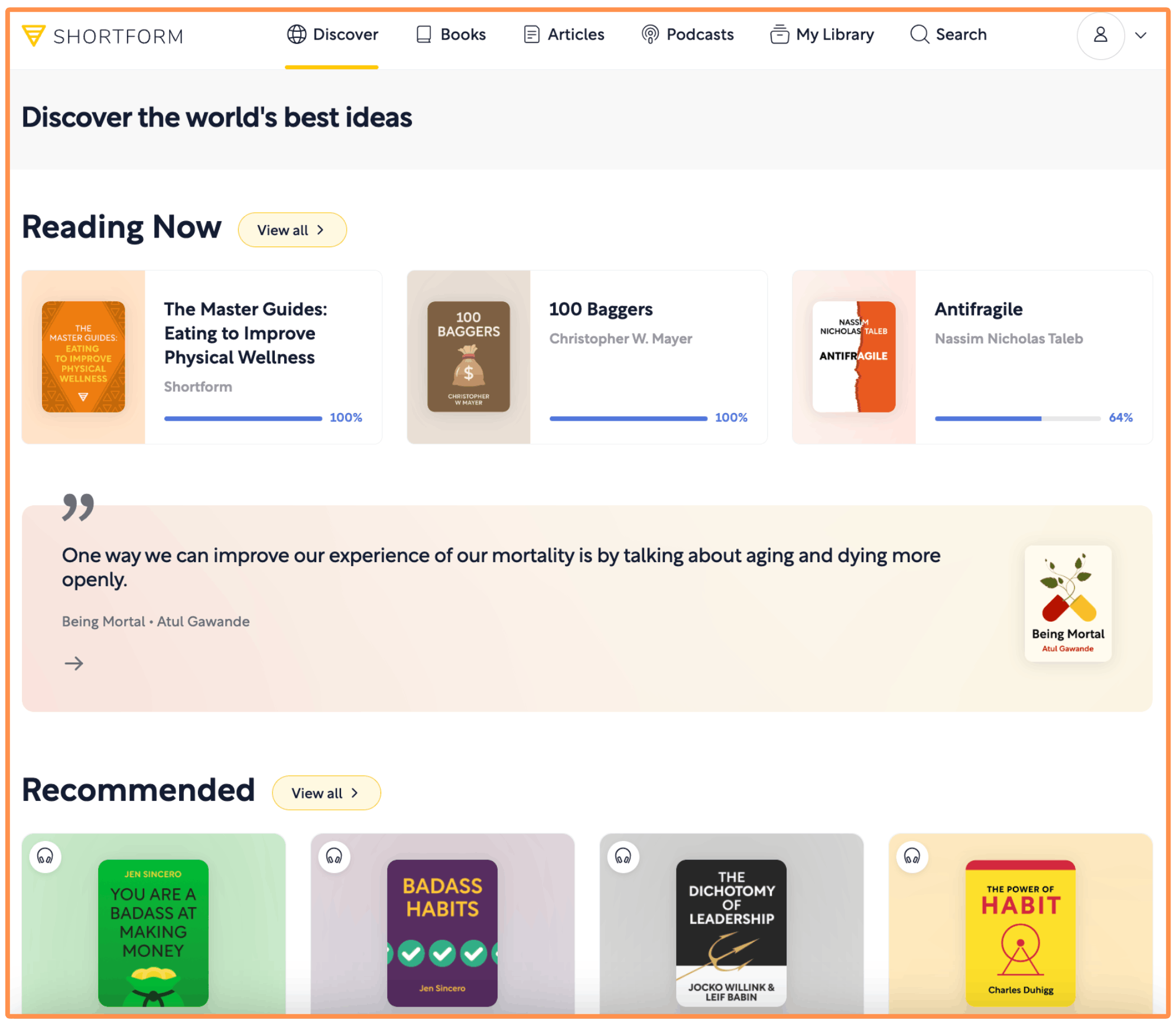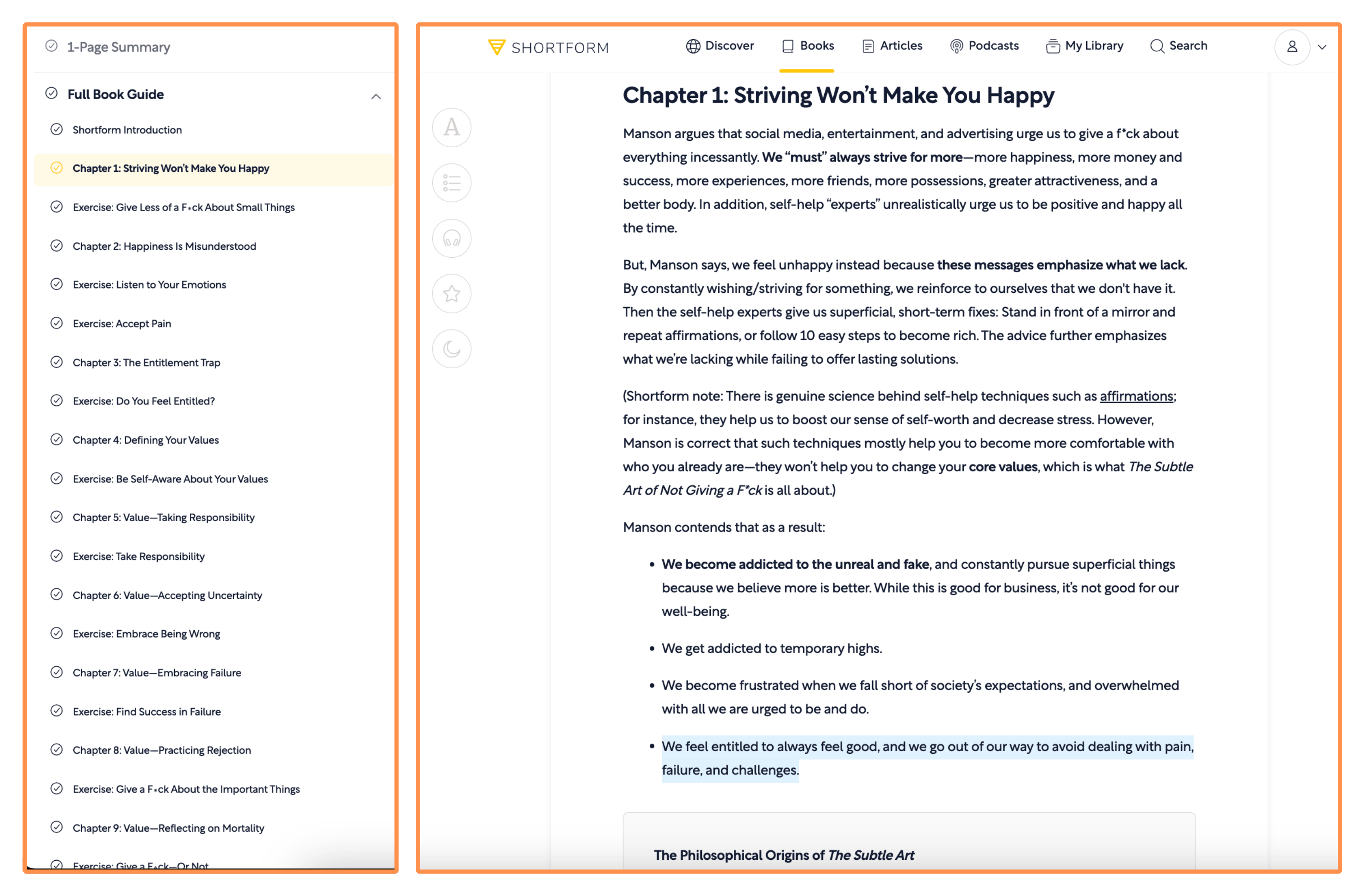 If I had to point at only one thing that makes Shortform truly special, it would be the depth of their summaries — they’re by far the most in-depth summaries you can find! They even have a chapter-by-chapter breakdown (for classics and bestsellers) — where they summarize each chapter of the book. So I think Shortform’s content feels more like study guides than traditional book summaries — which is fantastic to grasp a deeper understanding of the ideas in the books! And if you want to read something quick, they also have a “1-Page Summary” version.
