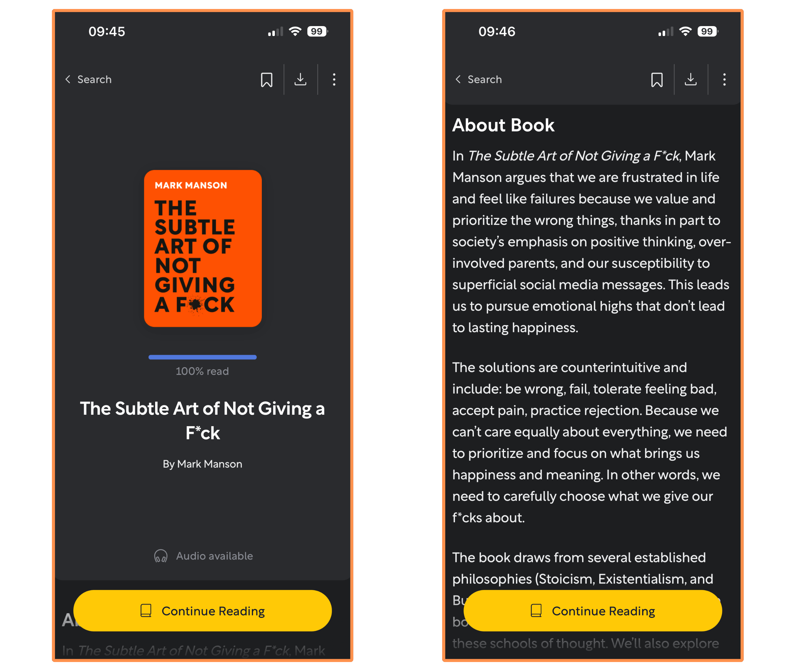 To illustrate my research, we’re going back to the book The Subtle Art of Not Giving a F*ck. This is how the cover of the summary looks on Headway: