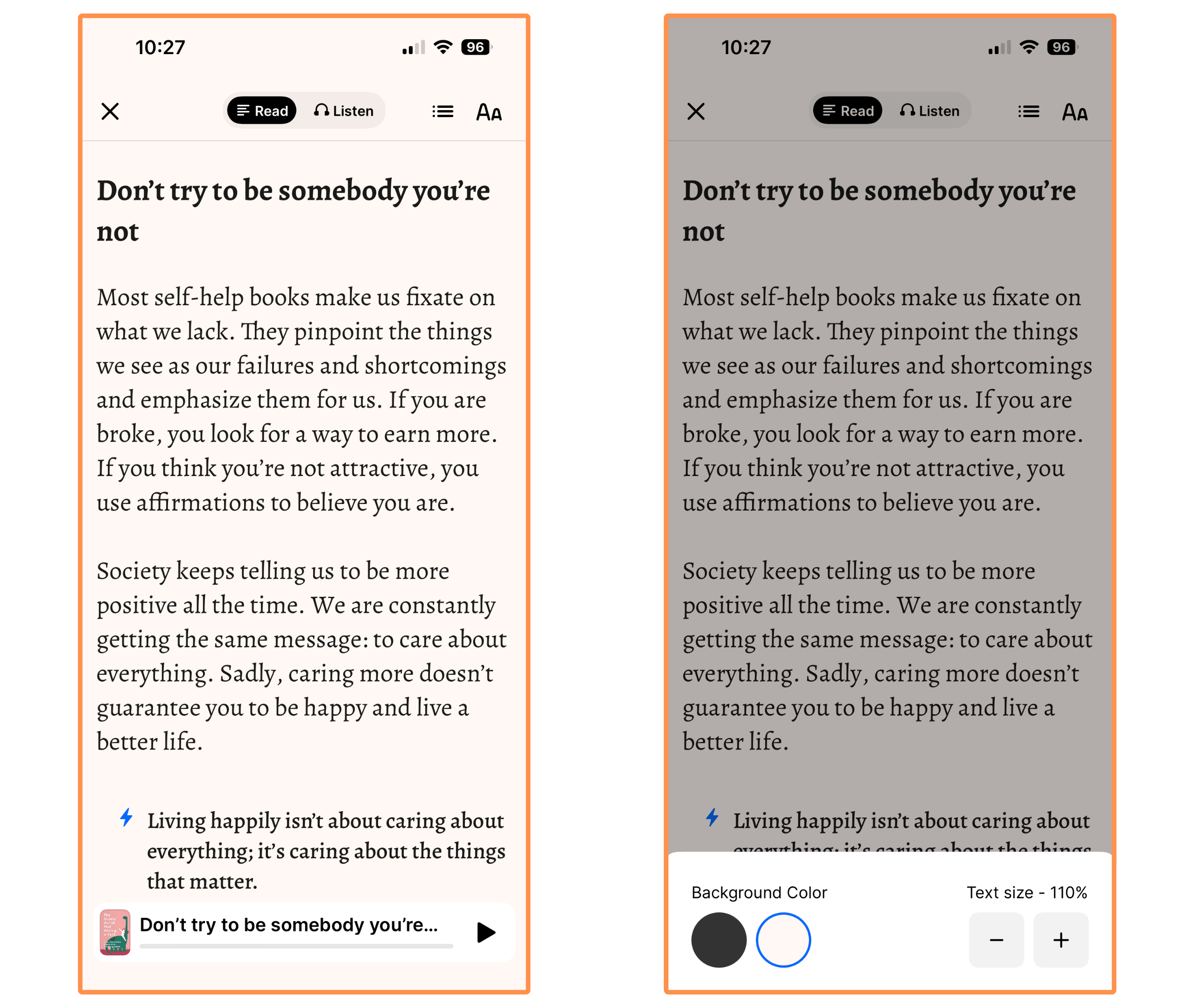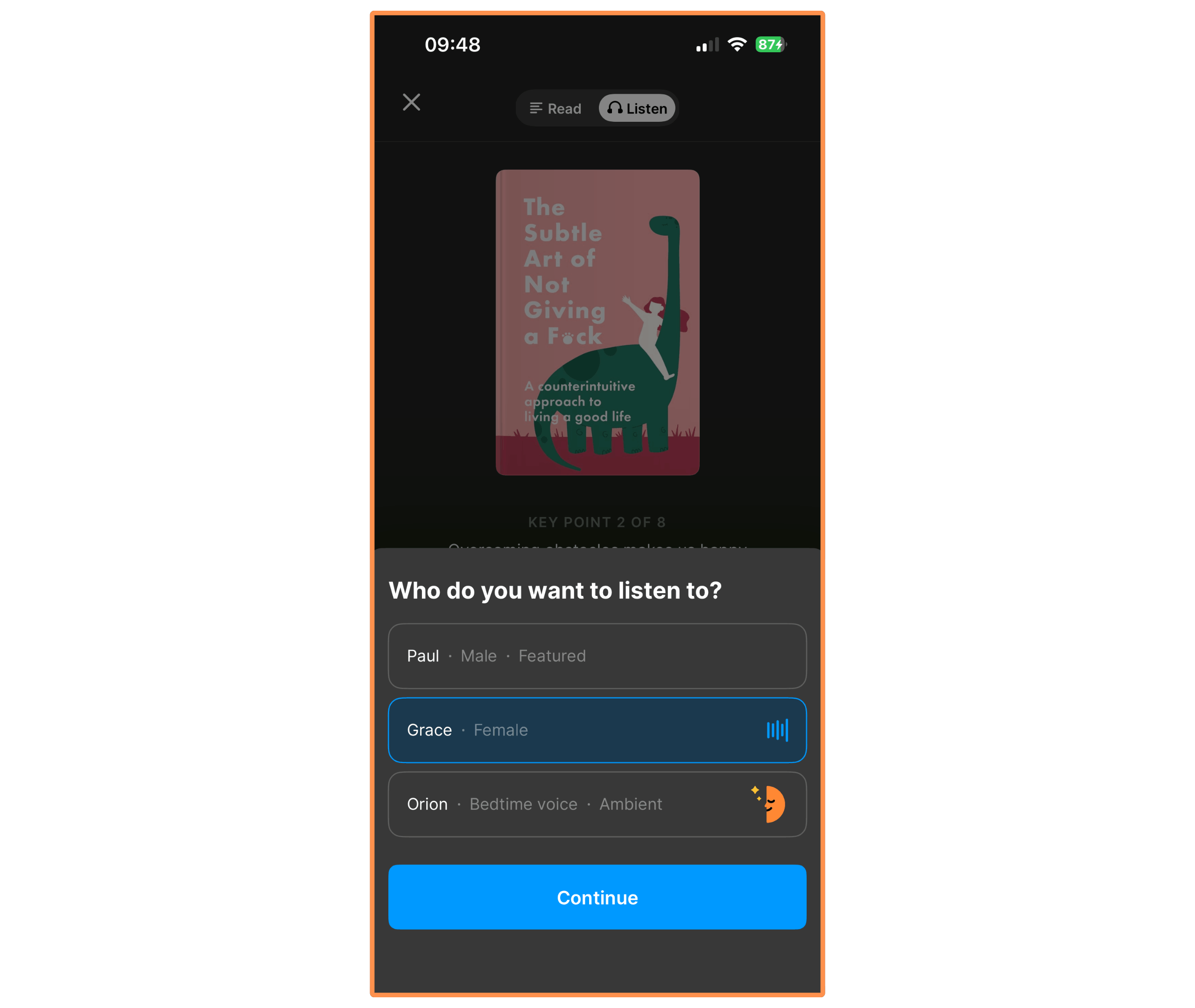 Finally, all Headway summaries come with an audio version — and you can choose between Paul (male voice), Grace (female voice), and Orion (“bedtime” voice).