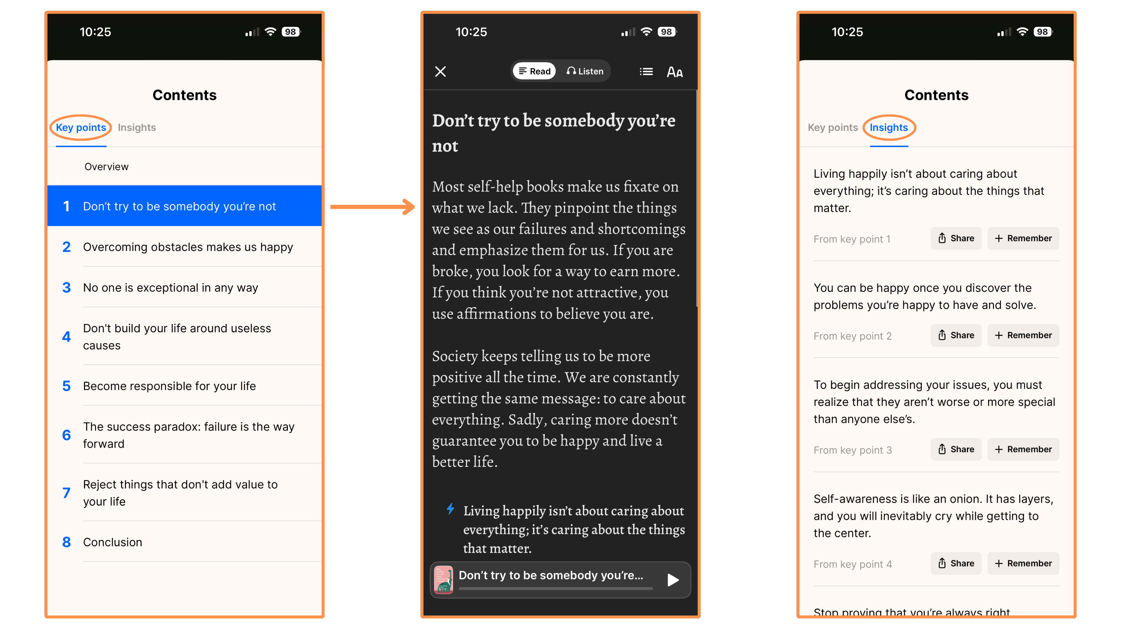 In the Headway App, a summary consists of a list of “key points”, which are sort of the key ideas of the book. And they also have a list of “insights”, which are basically one-liners that kind of summarizes the key points themselves (exactly… the summary of the summary!).