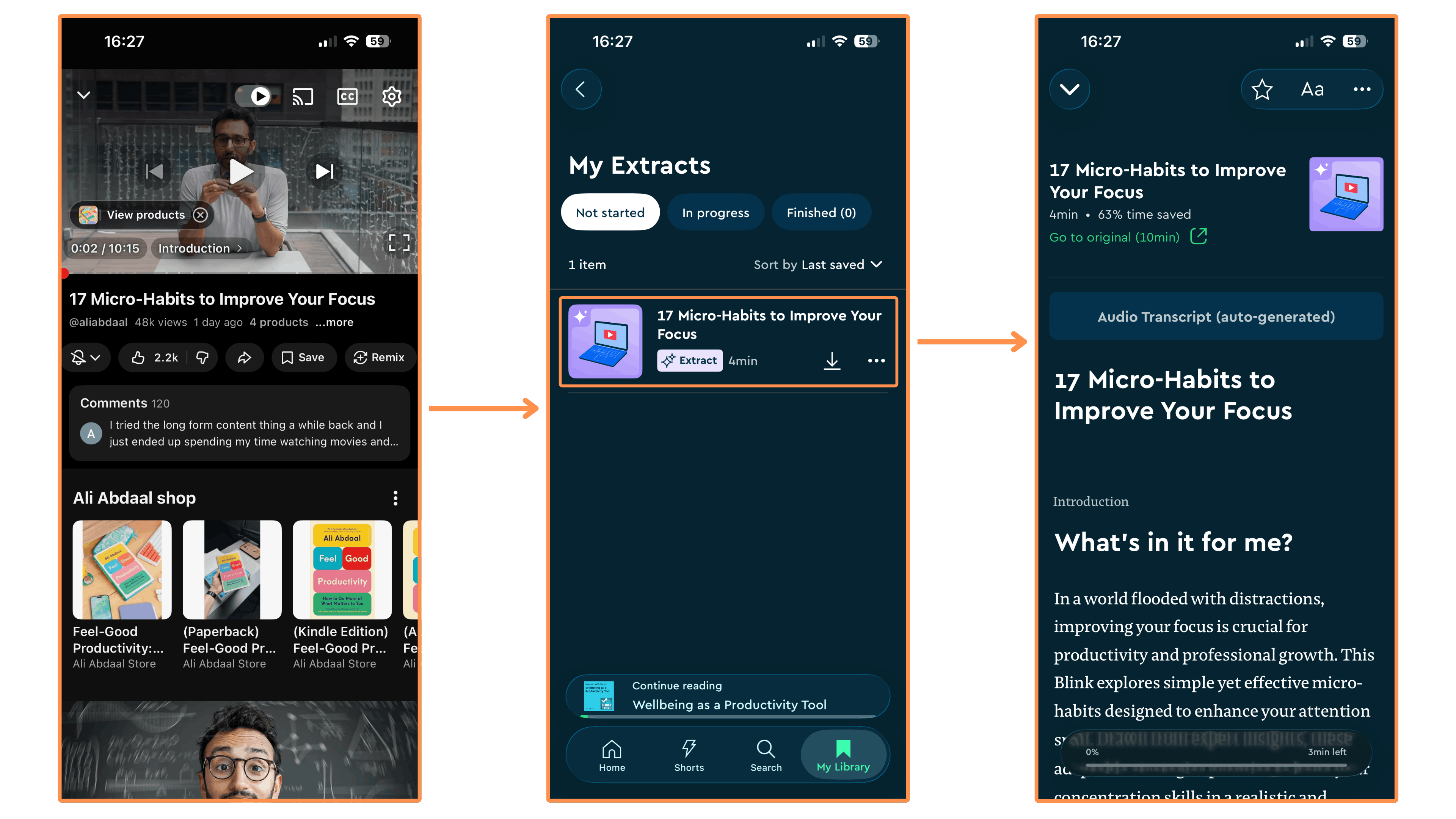 Audio Shorts → These are audio clips (taken from Blinkist’s Shortcasts) with a synced transcription on-screen. And they link to the respective Shortcast source at the end. (Tip → Expand the video to watch at full size!)