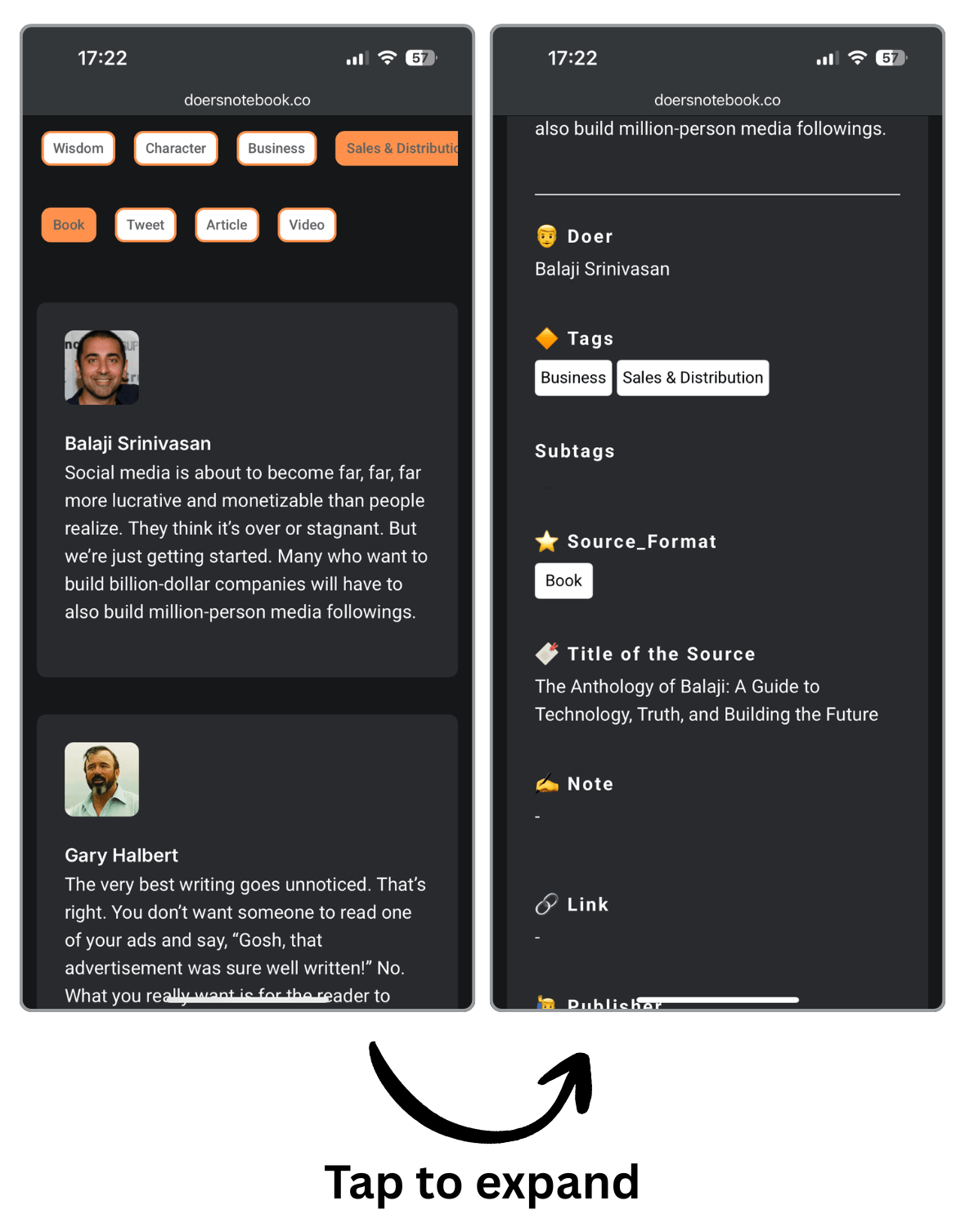 You can even filter them by topic (Wisdom, Character, Business, Sales & Distribution, Investing, Content Creation, Psychology, Health) and source (Tweet, Book, Video, Article).