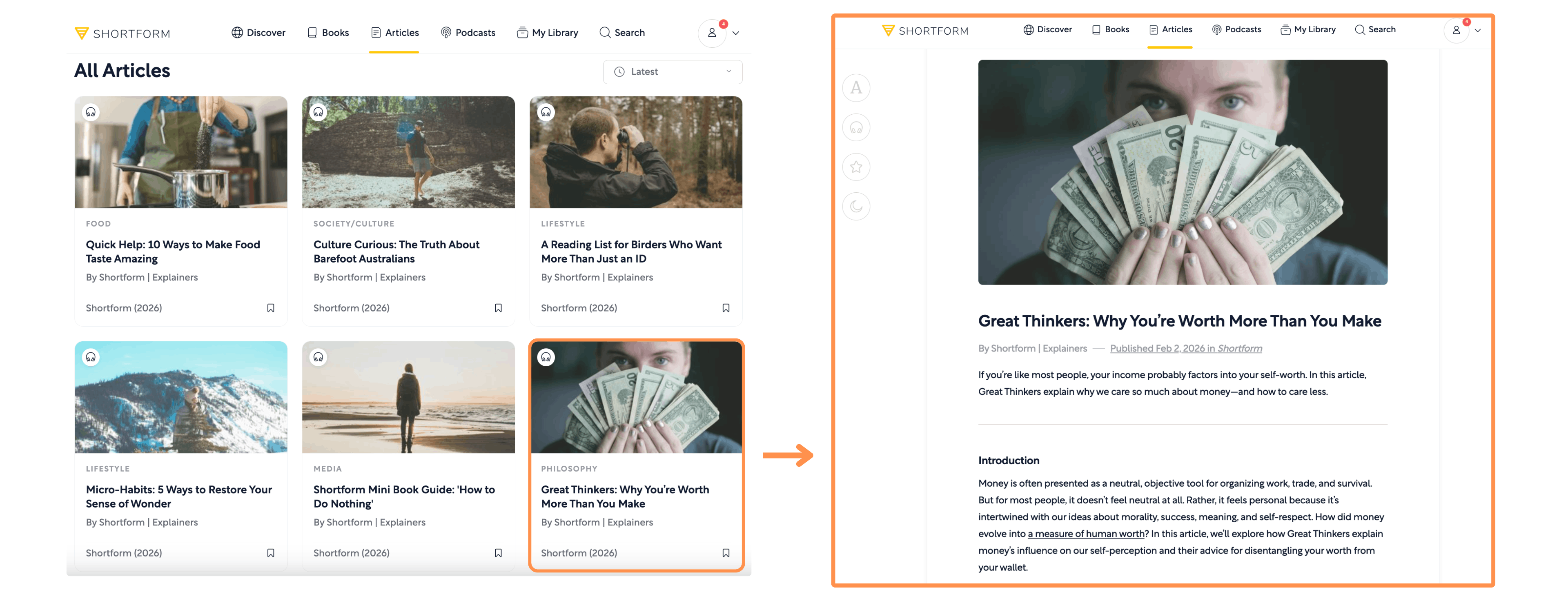 Video shorts → It features a person explaining you an insight from a book summary or an external article. At the end of the short, you can check out the respective book summary or article. (Tip → Expand the video to watch at full size!)