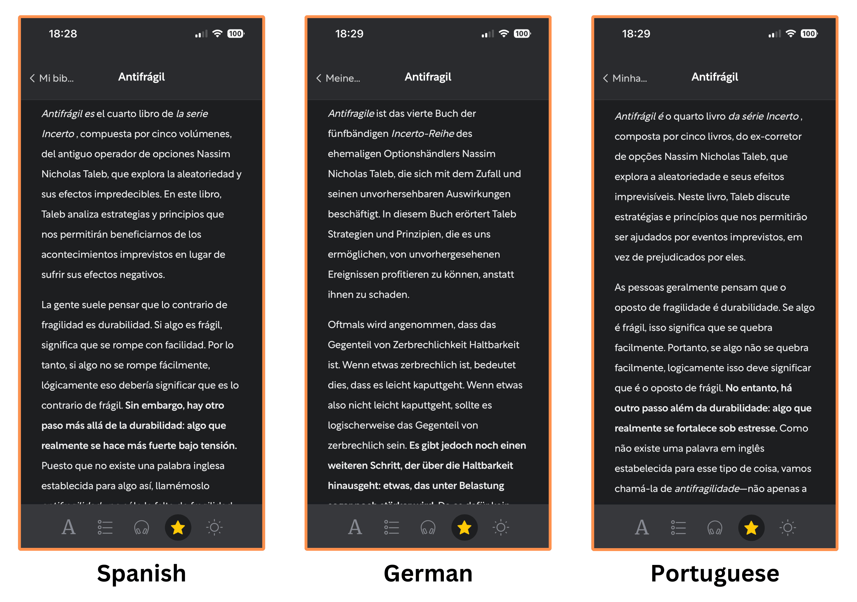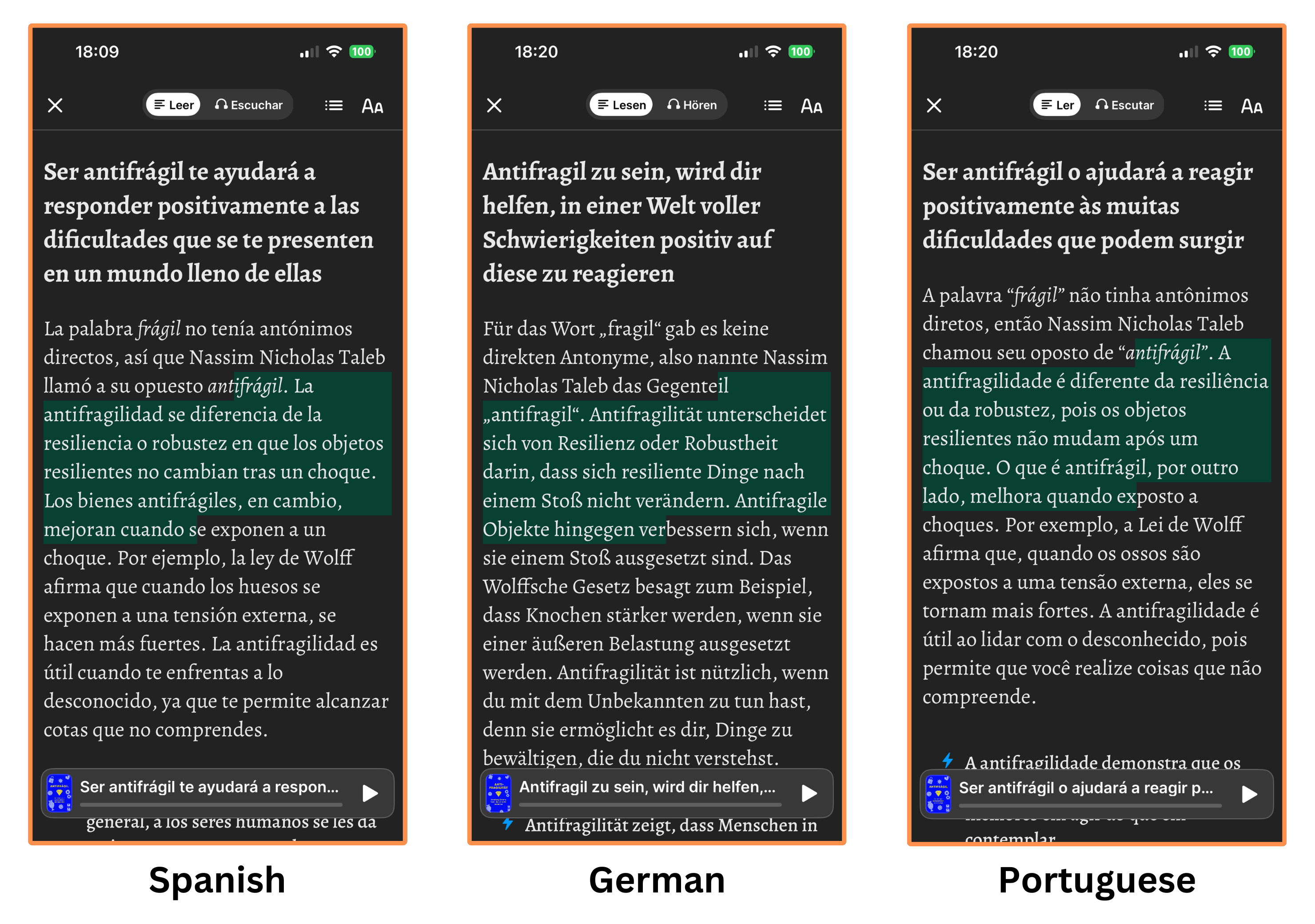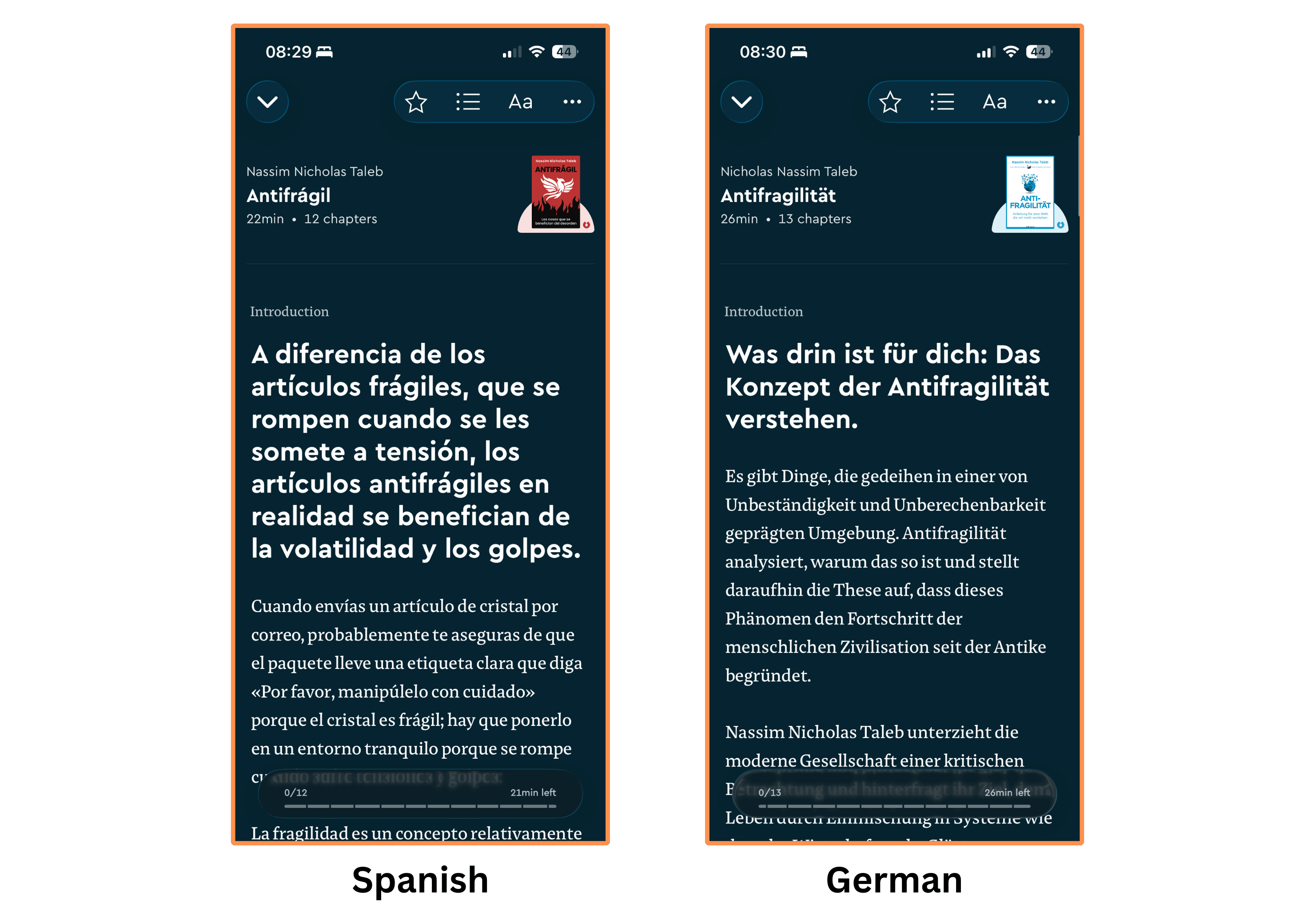 You can also switch from English to Spanish, German, Portuguese, French, or Italian. Although I couldn’t find the summary of Antifragile in neither French nor Italian…