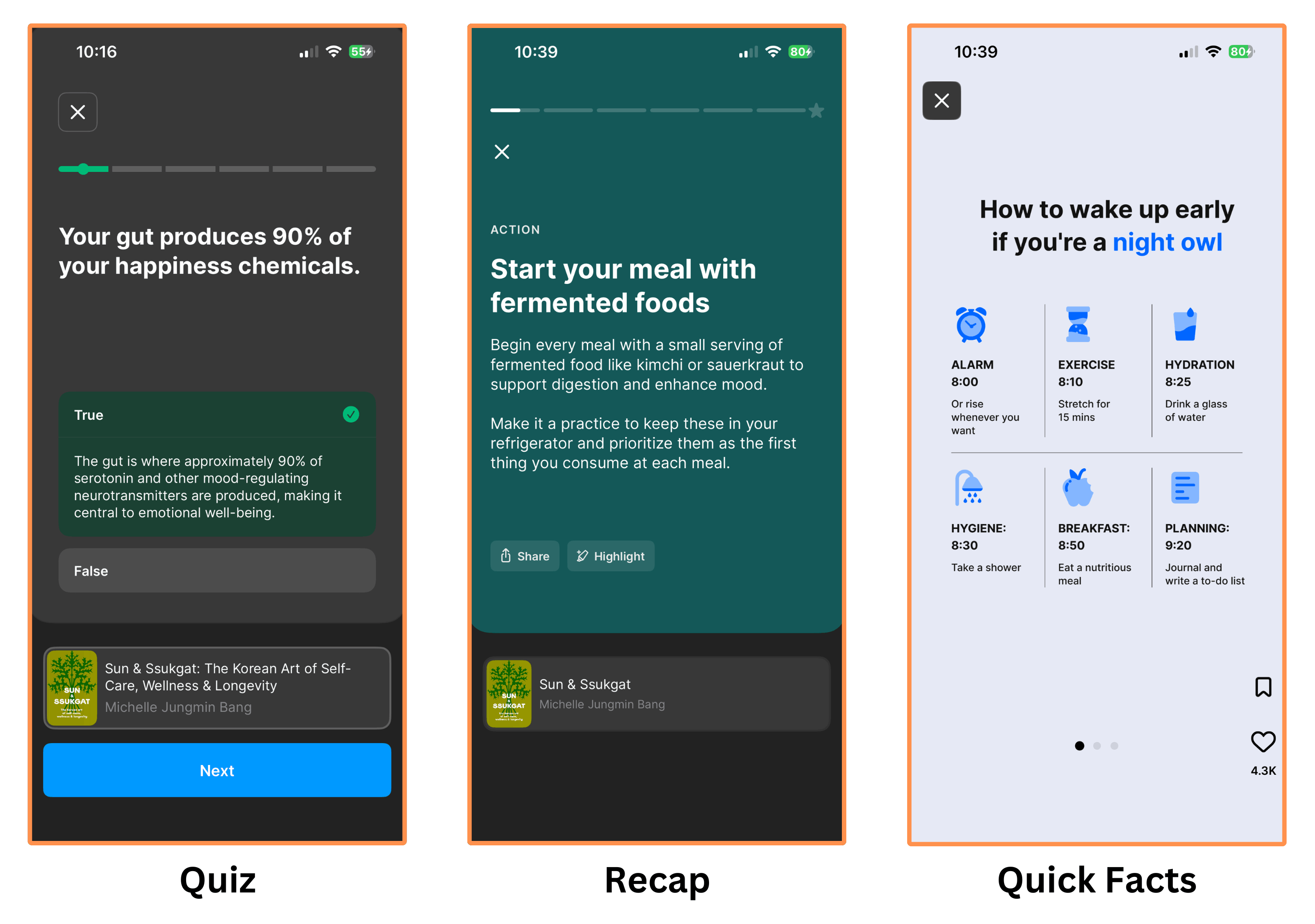 An interactive plan expands on the summaries by offering quizzes, recaps (which contains highlights and action points), and “quick facts”. Here’s how it looks…