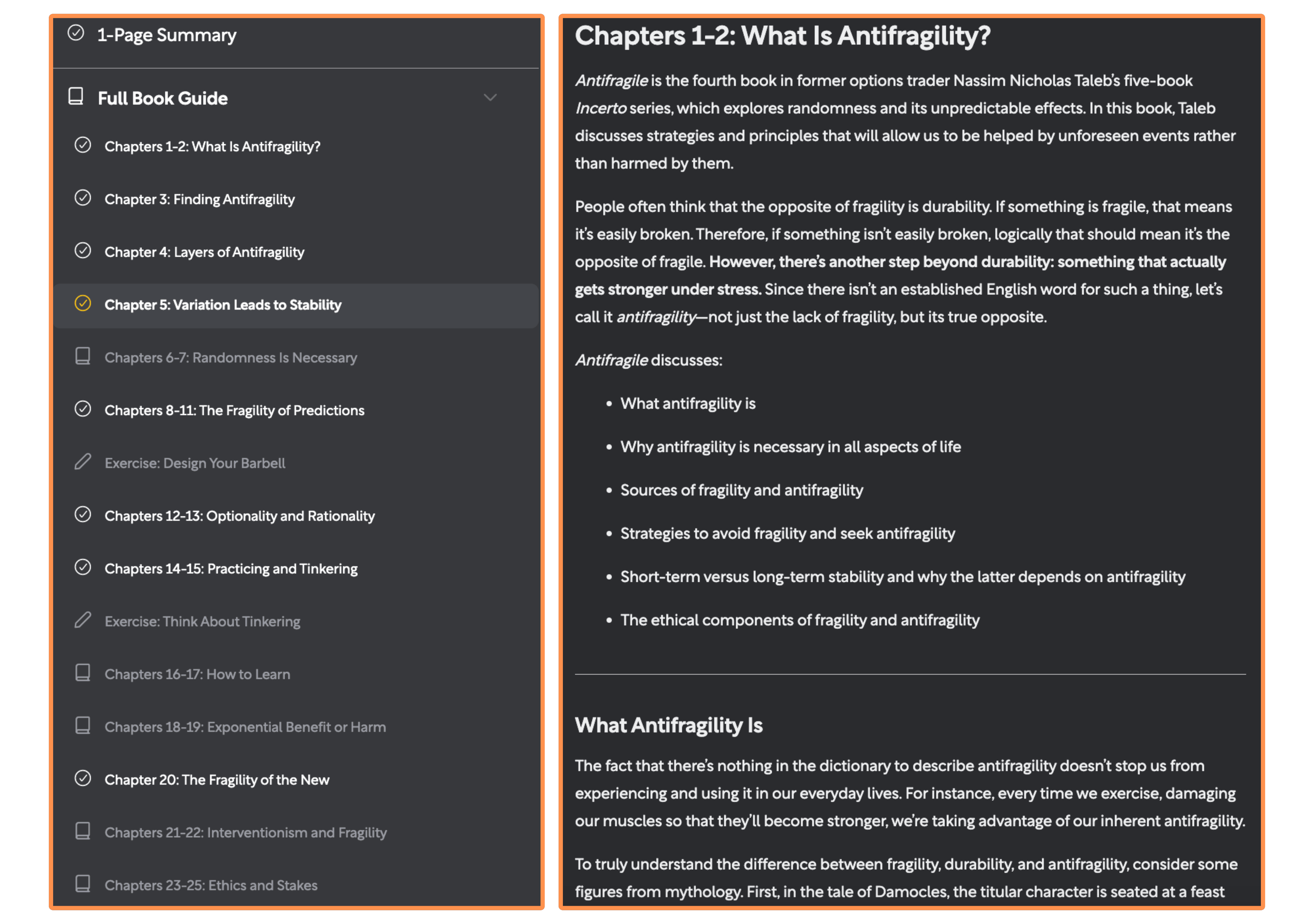 Shortform summaries have a “1-Page Summary”—which is sort of like a quick overview of the whole book. And for the classics and bestsellers (such as Antifragile) they have a chapter-by-chapter breakdown—where they summarize each chapter of the book. But even the “1-Page Summary” is pretty deep—the audio typically ranges from 25 to 50 minutes. So I think Shortform’s content feels more like study guides than traditional book summaries—which is fantastic for gaining a deeper understanding of the book’s ideas!