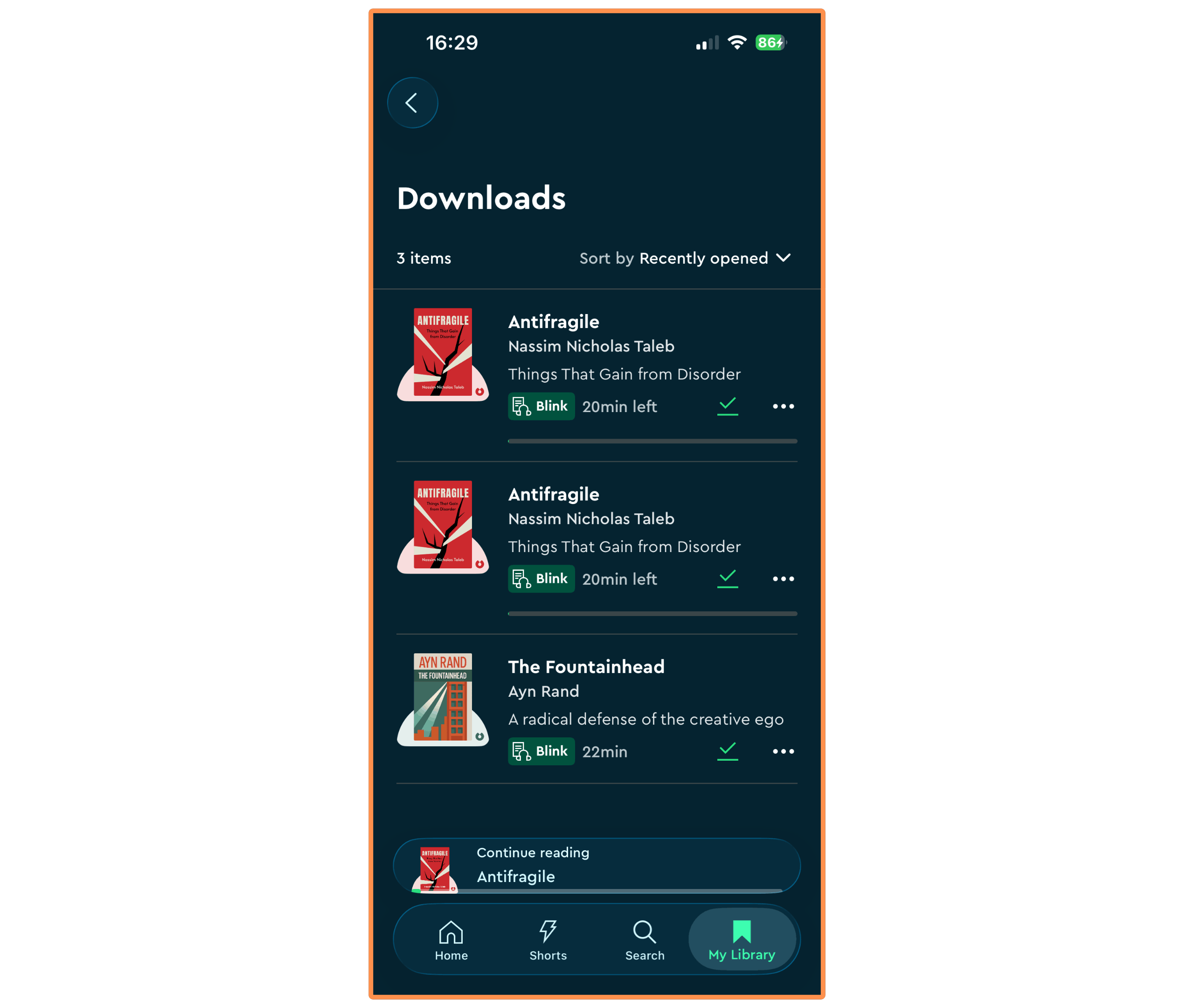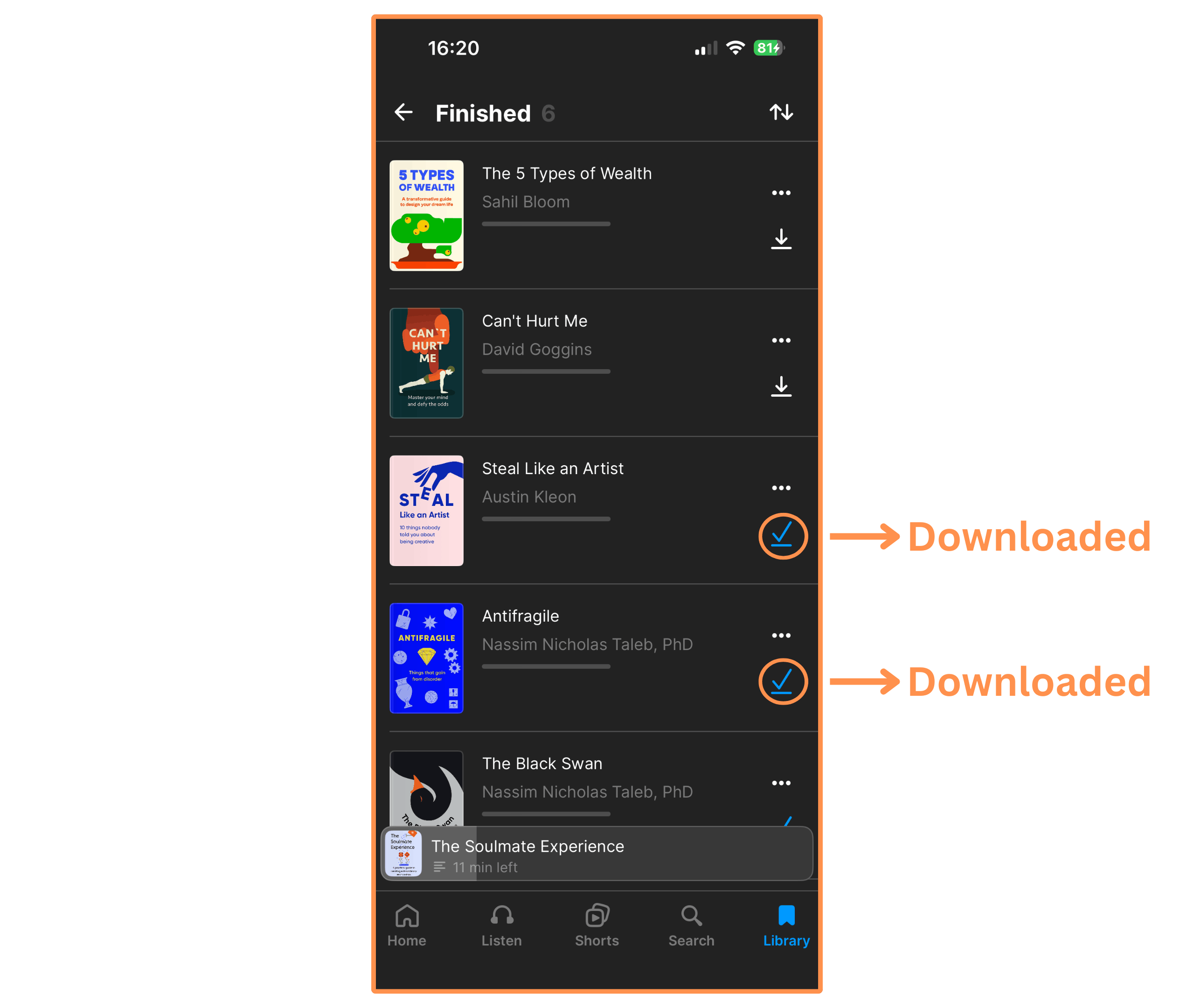 Similar to Headway, Blinkist also lets you download (in-app only) any book summary. And like Shortform, they have a section where you can find all of your downloads.