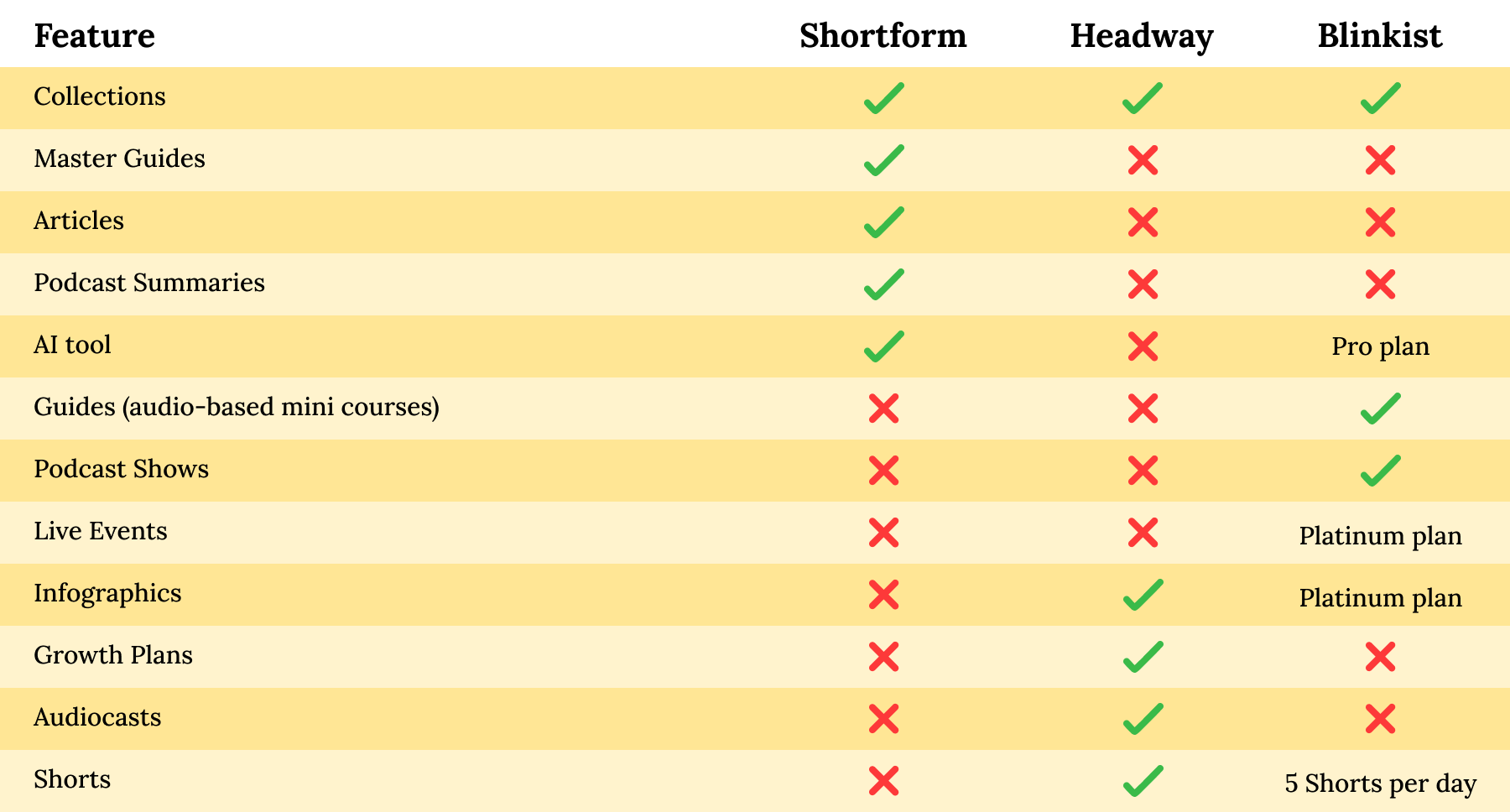 In the case of audio-based features (such as Blinkist’s Guides or Headway’s Audiocasts), I personally wouldn’t use them—because when I want to listen to something I prefer to put on a podcast (my three favorites: Acquired, Founders, and Philosophize This!). Same with the AI tools from Shortform and Blinkist… I rather just use Chat-GPT!