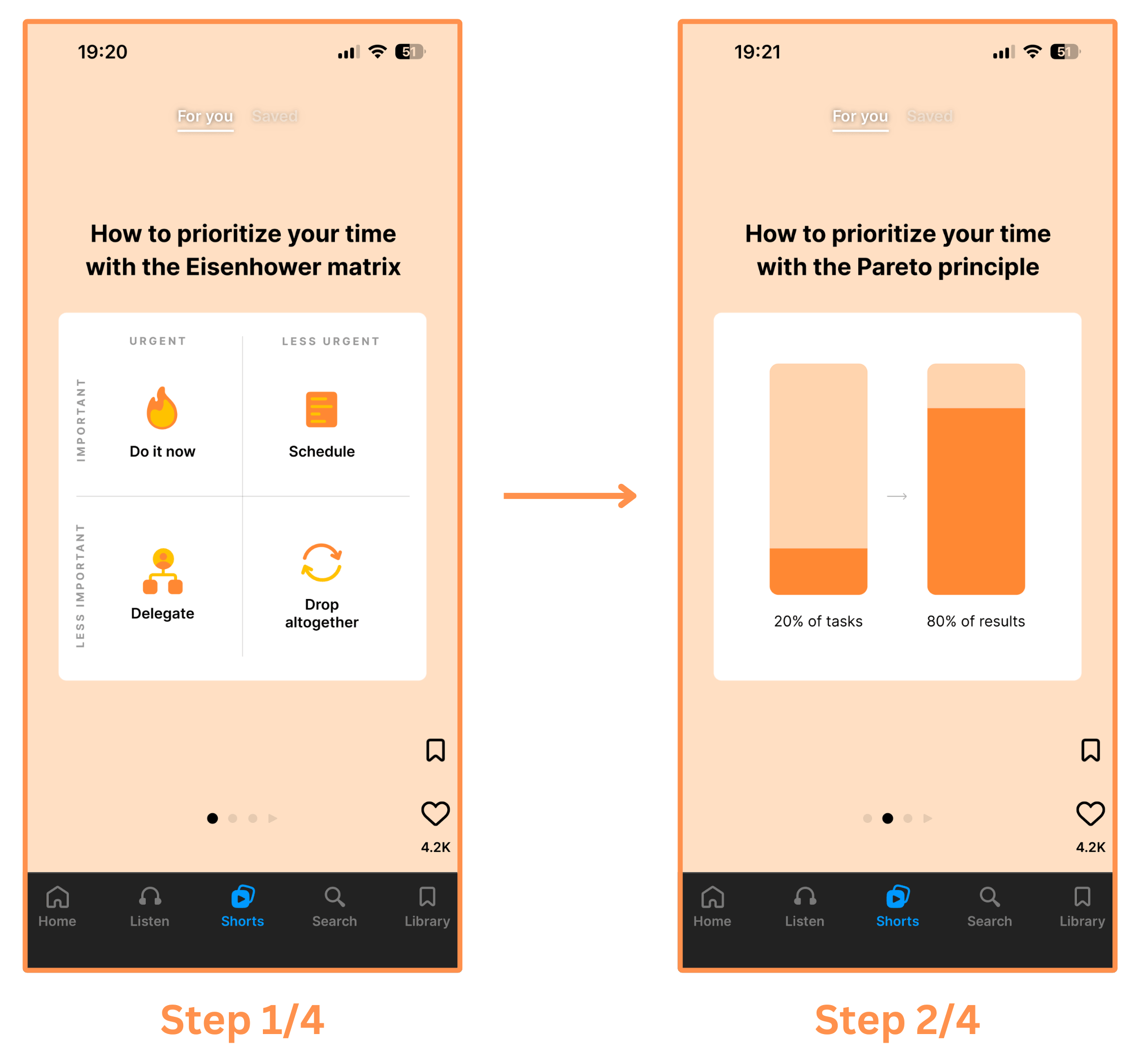 Shorts (mobile-only feature) → These are super fun introductions to the book summaries (featuring insights, interesting facts, and stories). They have text shorts and infographic shorts (similar to Instagram posts), and video shorts (similar to Instagram reels). And you swipe vertically to move through them.