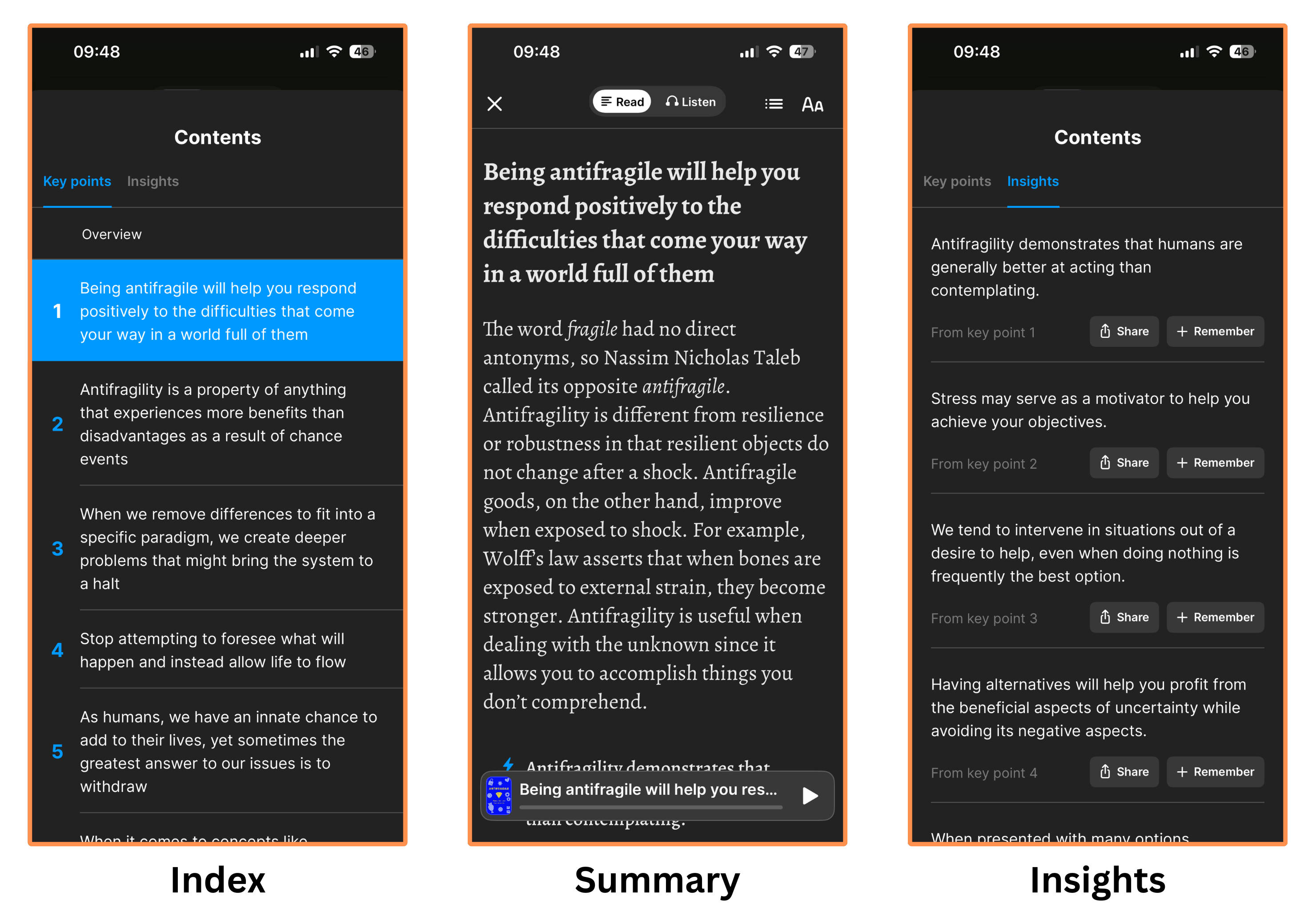 So, for the book Antifragile, they have a list of 7 key points (with a conclusion at the end) and 8 insights.