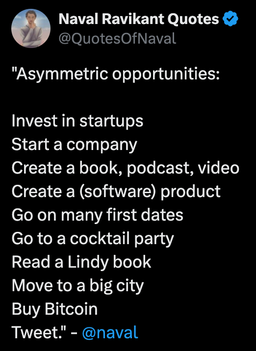 On this idea of collecting positive black swan opportunities, i remember a tweet from Naval Ravikant where he made his own list of asymmetric opportunities.