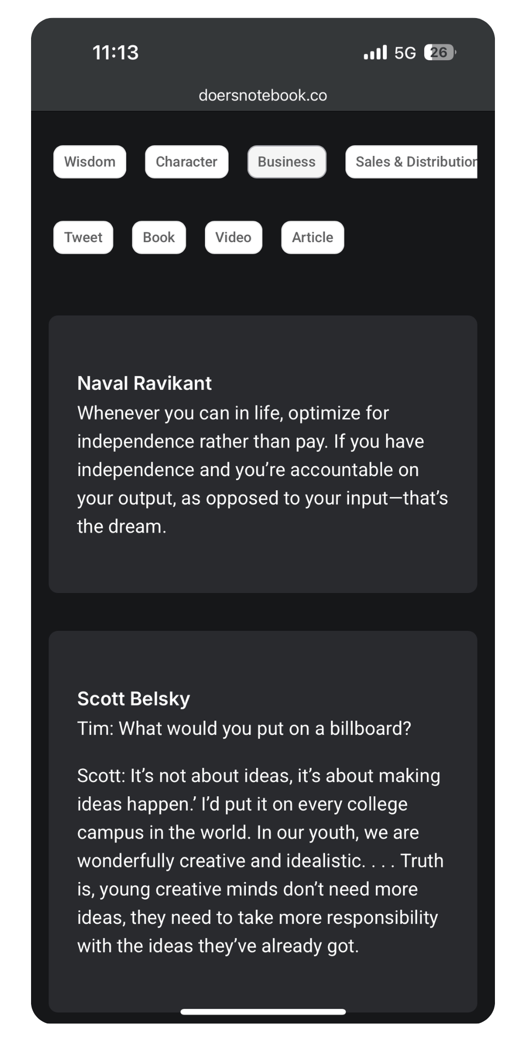 All the nuggets I’ve picked for the past 5 years are saved and classified in a searchable database, which (as of February 2026) contains over 5,000 timeless ideas (sourced directly from the most influential doers and entrepreneurs — captured on books, interviews/podcasts, tweets, and articles).